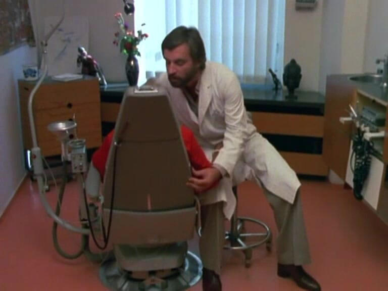 In the closed room, Richard pins Brigitte on the seat, spreads her white panties and fingers her wildly, his fingers working her soaked clitoris. He kneads her breast, pinches her hardened nipples, making his moans gush out. The assistant, behind the door, watches silently, shocked. Richard fucks her missionary on the dental chair, then lifts her up to take her into a sitting position, their bodies slamming hard, his cock filling her to ecstasy.